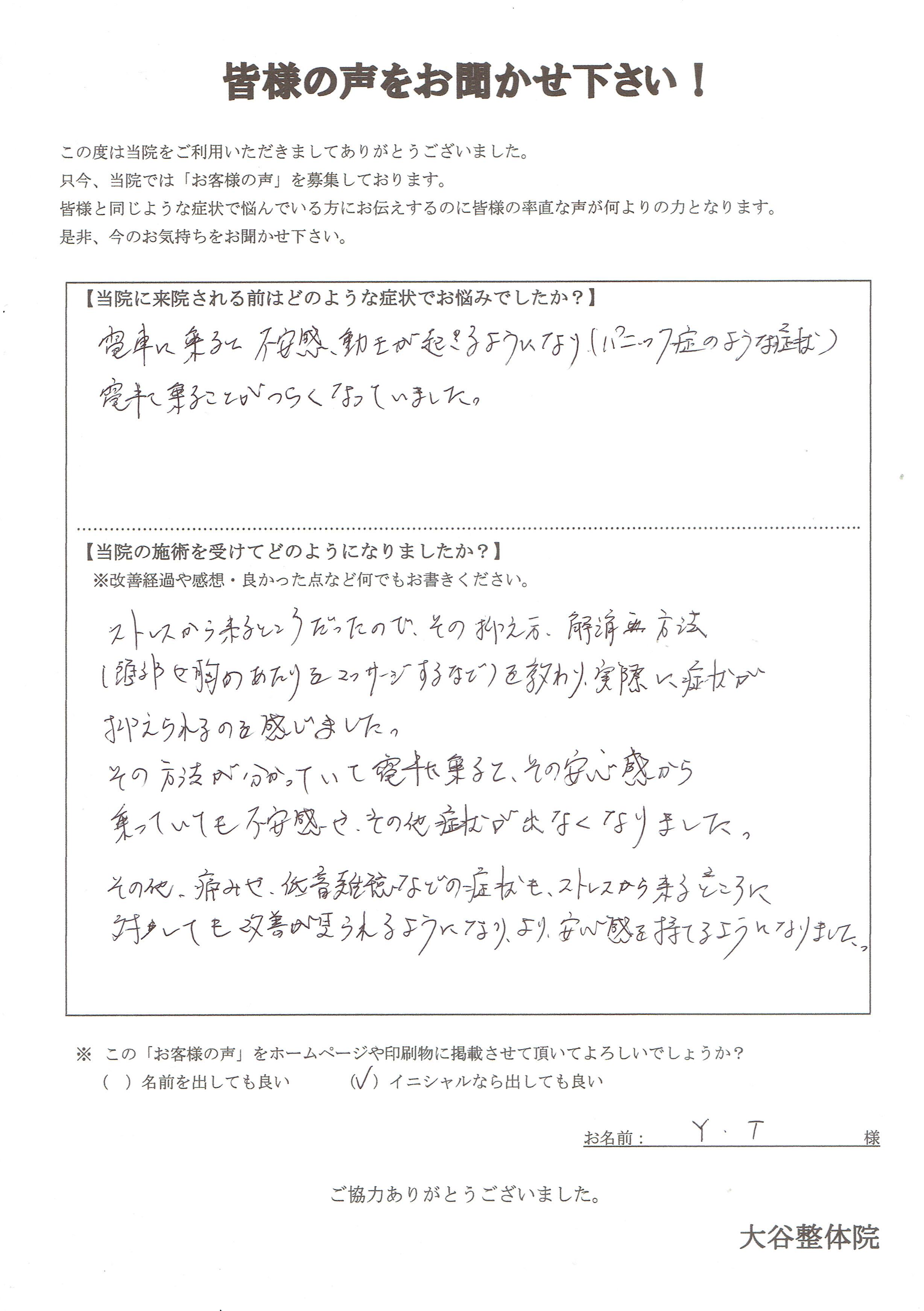 発作(不安・動悸・息苦しさ)が出ても教えて頂いた体の一部をもみほぐすことで不安も和らぐようになり、アドバイスを頂いたおかげです。