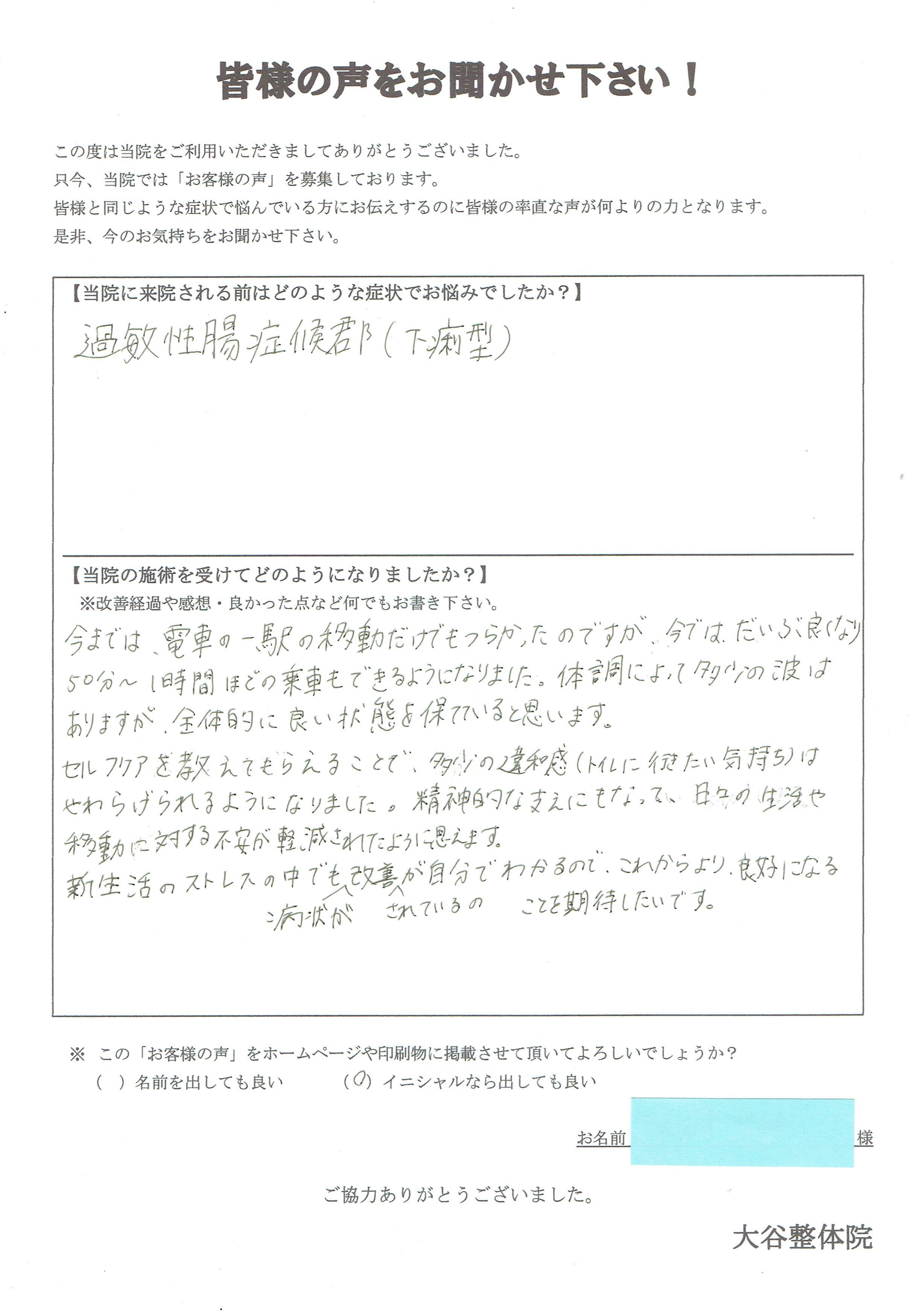 まずは当院の施術を受けて「過敏性腸症候群」改善された喜びの声をご覧ください。