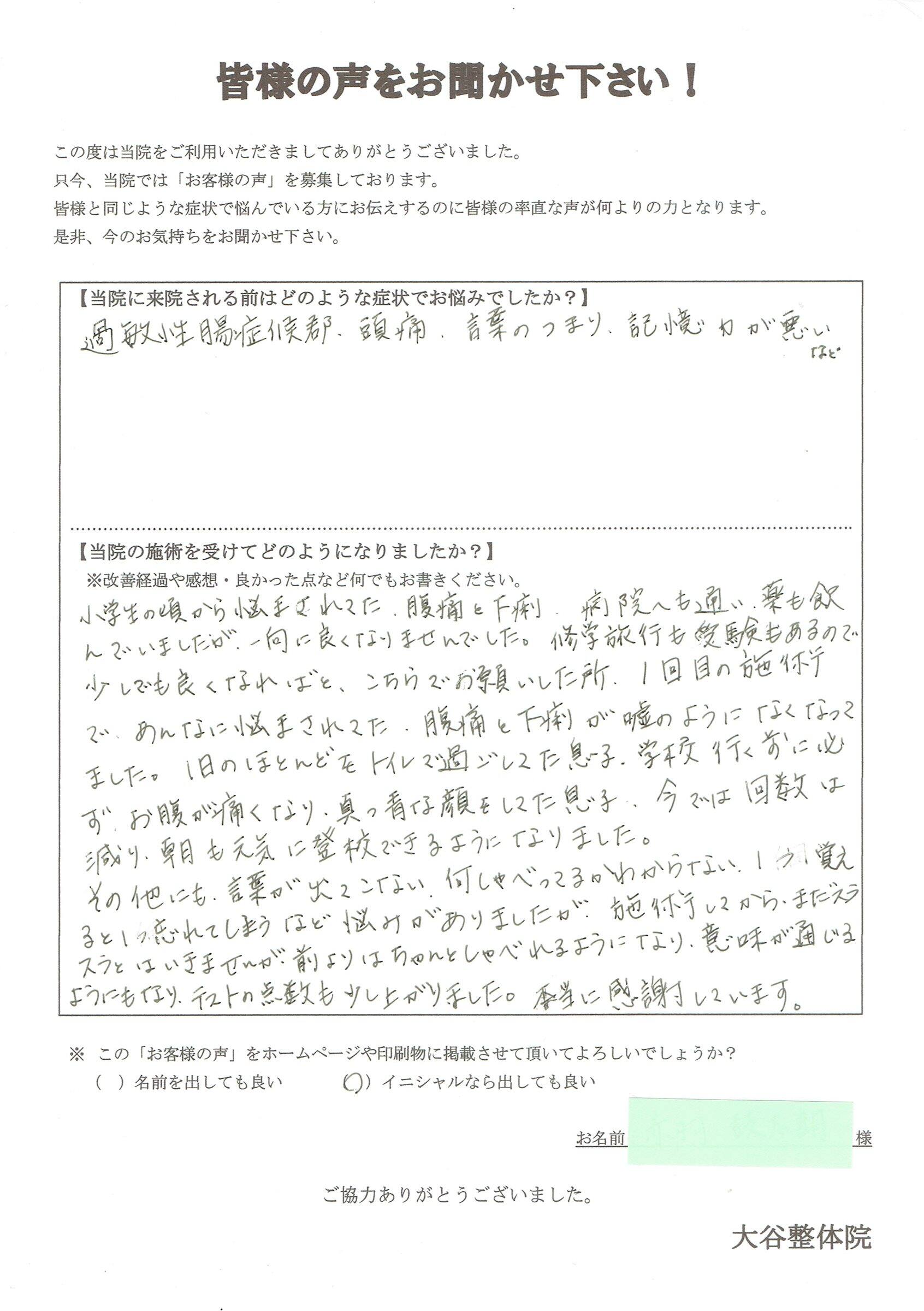 その他にも言葉が出てこない、何をしゃべっているか分からない、1つ覚えると1つ忘れてしまうなど、悩みがありましたが、施術してからまだスラスラとはいきませんが、前よりはちゃんとしゃべれるようになり、意味が通じるようにもなり、テストの点数も少し上がりました。