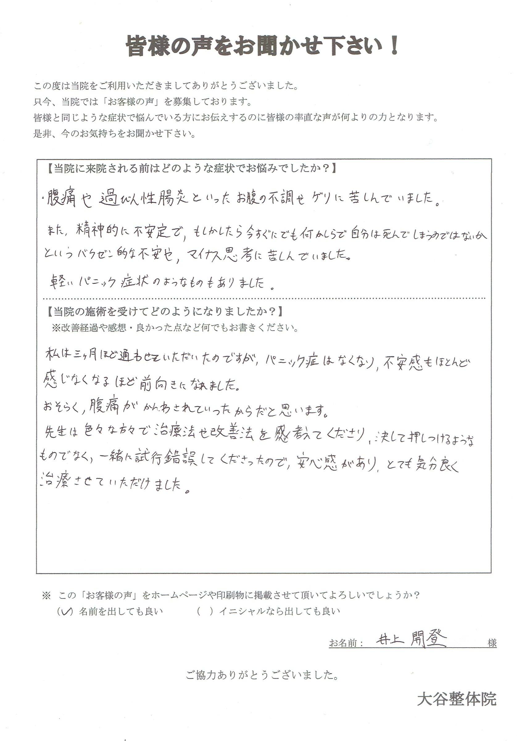 様々なストレスから突然ガタガタと体調が崩れて動くことも辛くなり、病院では、貧血・腸炎位の診断ですが、更年期なのかウツなのか、ただただ体が重く不安な日々で、以前お世話になった大谷先生に見て頂き、脳ストレスからいろいろなところにダメージがきている事、軽いウツもあると思いましたが心療内科に行かずに体調が落ち着き、ストレスを少しずつ減らせるような助言や自分でできるマッサージ等、沢山教えて頂き、大丈夫・大丈夫・・・と、とても安心させて頂きました。